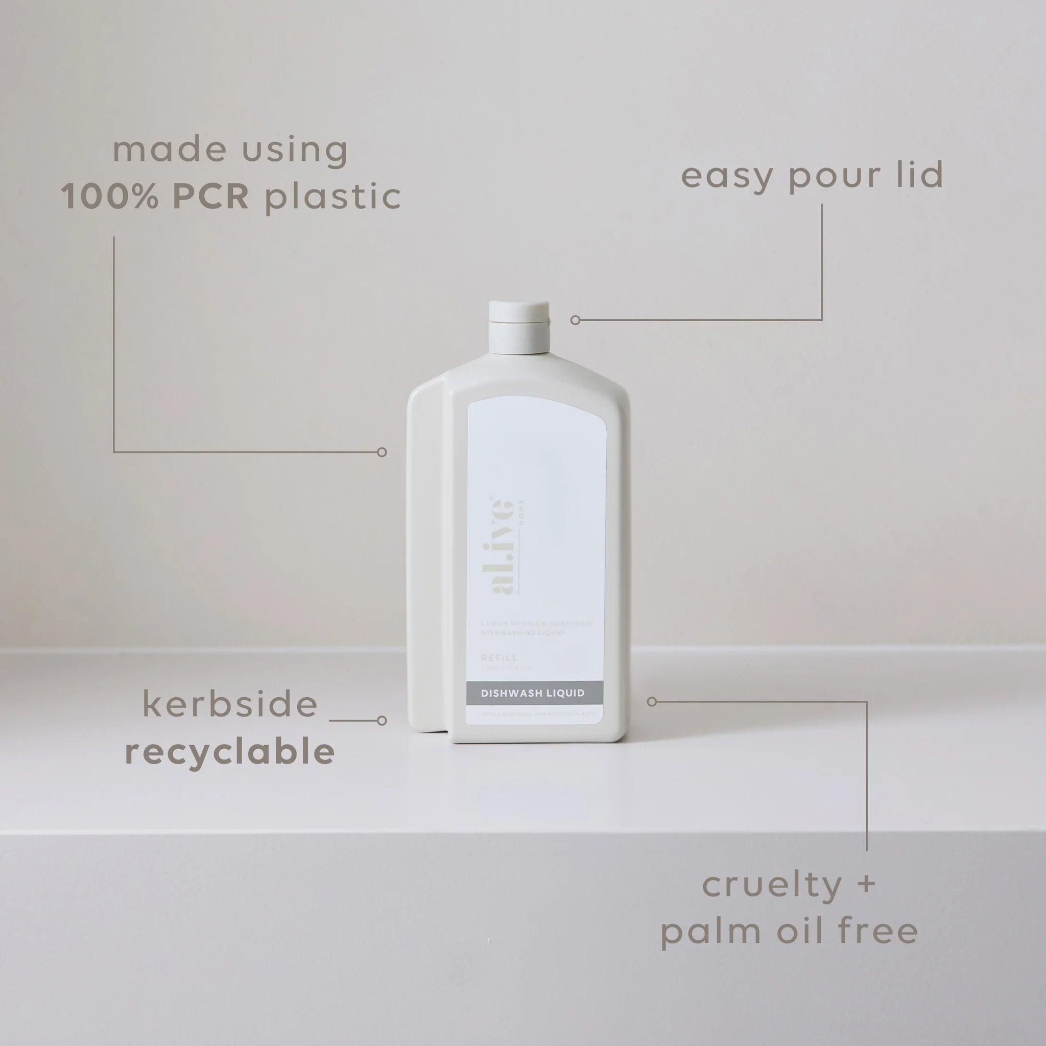 al.ive Body's 1L Lemon Myrtle & Honeydew Dish Wash Refill is housed in a durable bottle made from 100% post-consumer recycled (PCR) plastic.