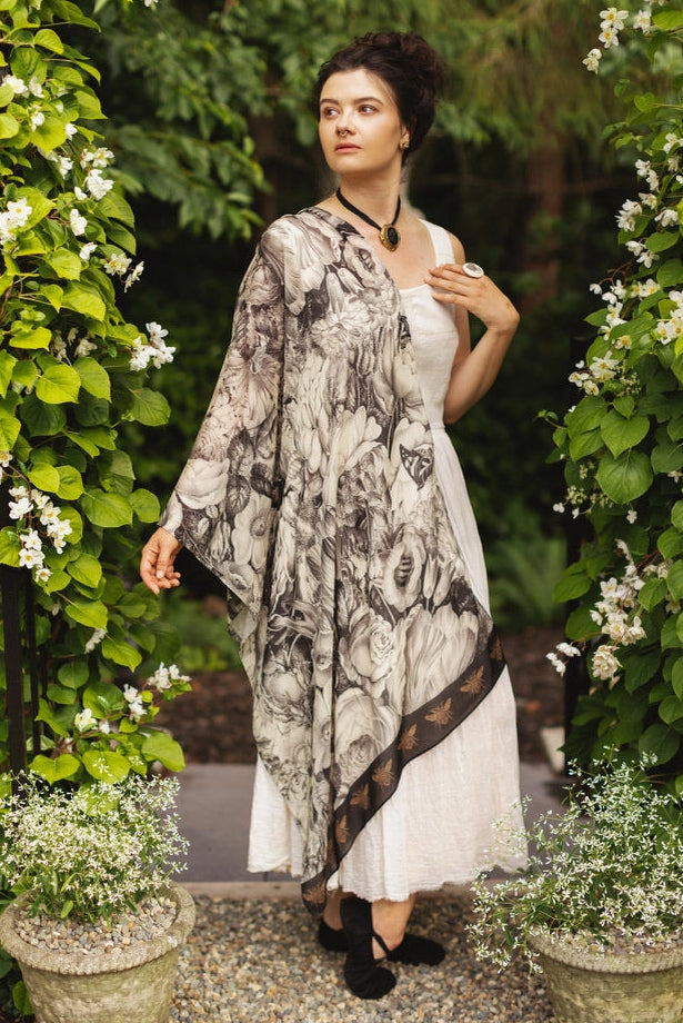 Inspired by the black-and-ivory palette of our little studio and house, this romantic floral design draws from a tangle of 19th-century lithographs. Trimmed in black with golden bees from an embossed Victorian book cover. A first for us in its totally neutral palette, Honey & The Moon is a departure in tone, but not in spirit.