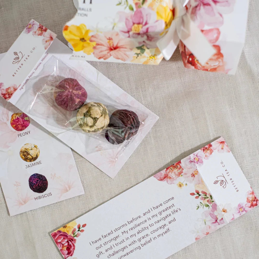 Each bon bon cracker contains: 3 x blooming tea balls - Peony, Hibiscus, Jasmine and an affirmation card.