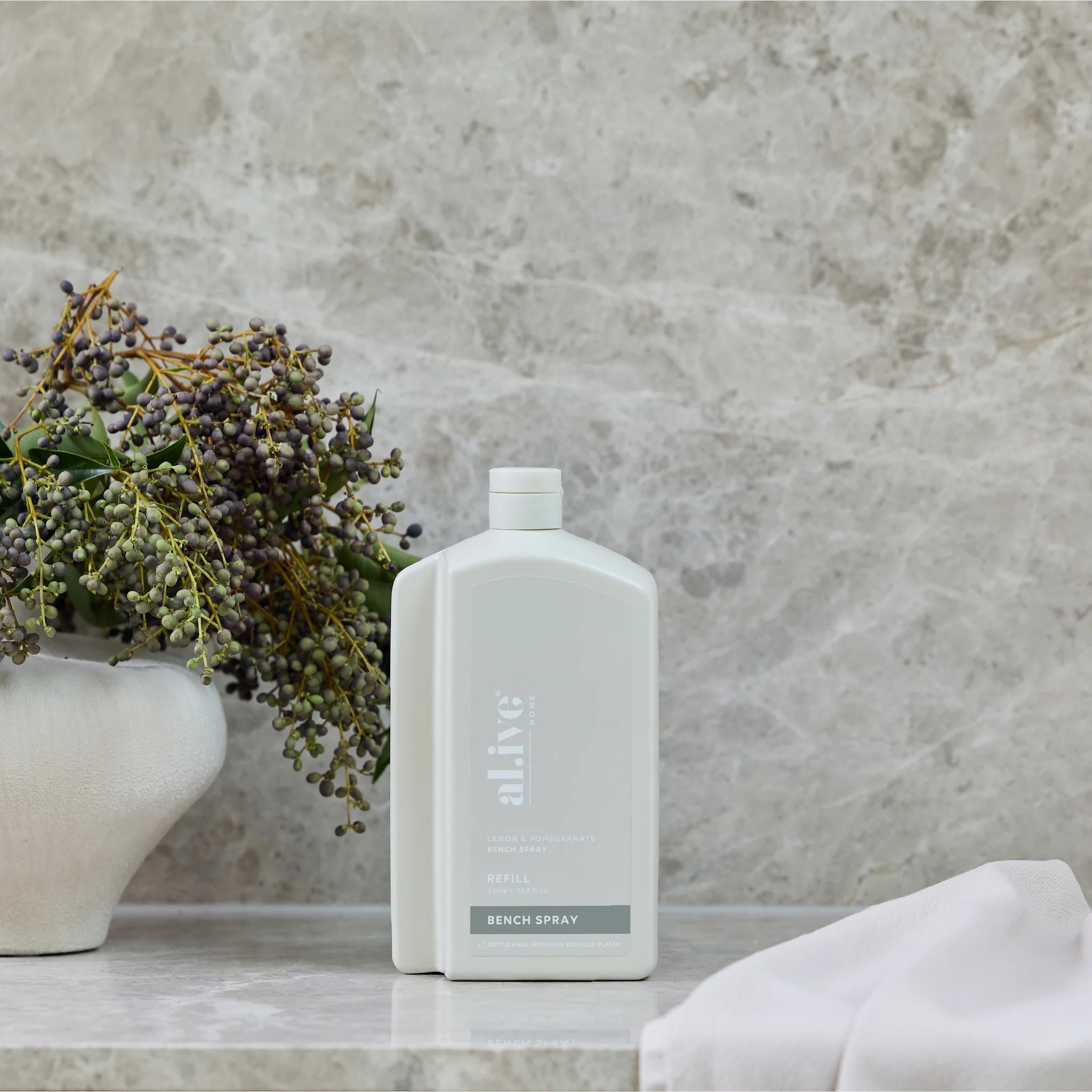 Refill your Lemon & Pomegranate Kitchen Bench Spray bottle with al.ive's 1L Kitchen Bench Spray Refill. This sustainable refill solution is designed to reduce waste and offer a practical, eco-friendly way to top up your favourite al.ive body essential.