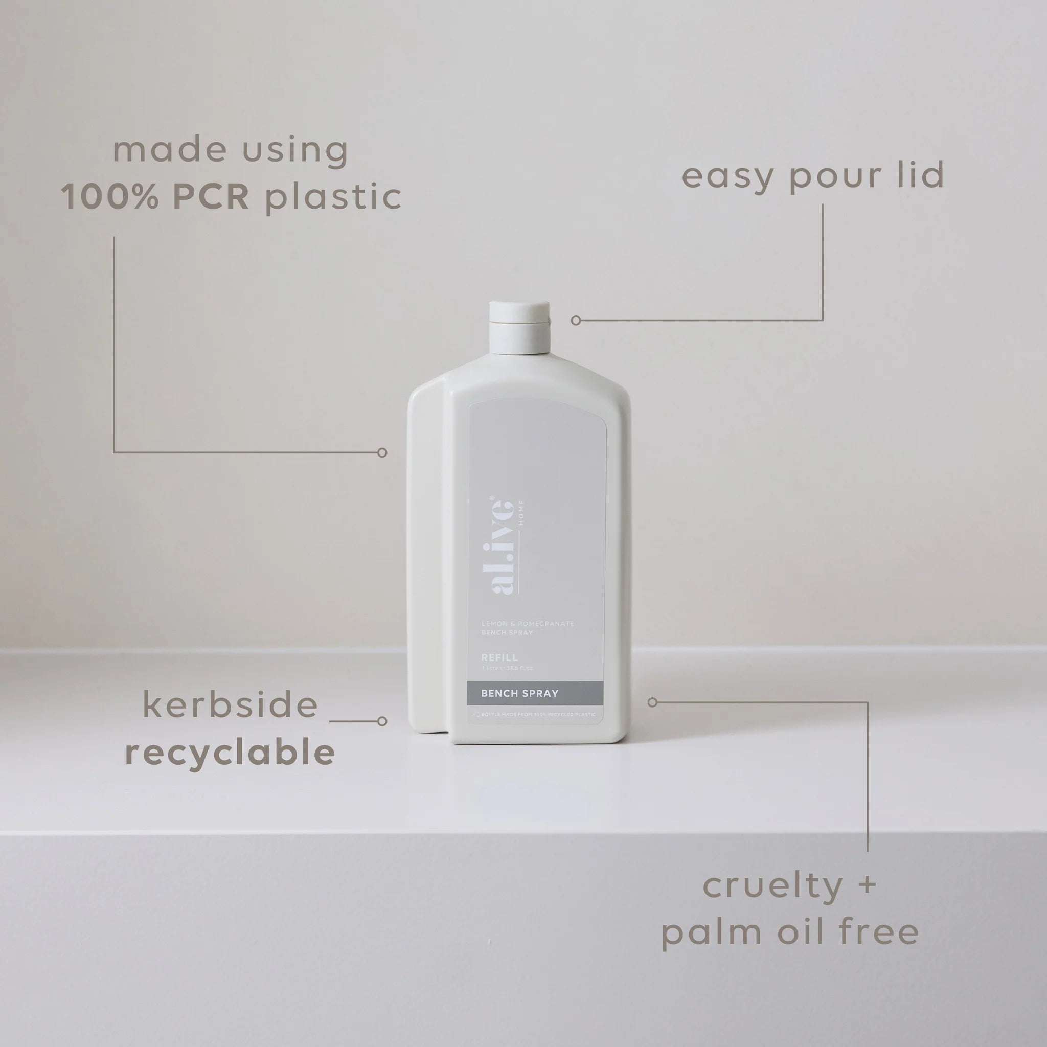Each refill is designed to refill the 300ml al.ive body Kitchen Bench Spray bottle over three times. With a controlled-flow spout for mess-free pouring, compact shape for easy storage, and full kerbside recyclability, it offers a practical, premium solution while extending the life of the product you already love.
