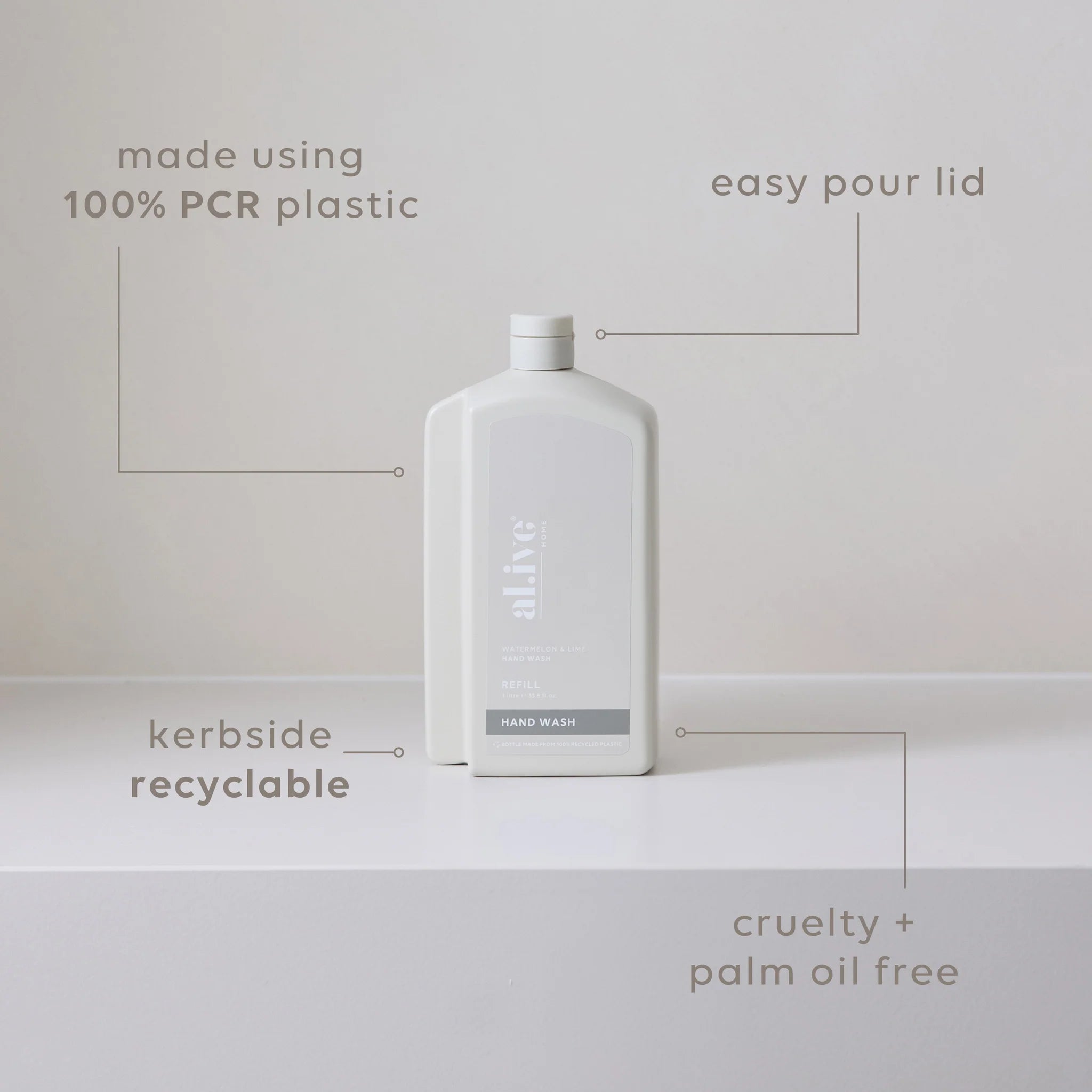 al.ive Body's 1 L Watermelon & Lime Hand Wash Refill is housed in a durable bottle made from 100% post-consumer recycled (PCR) plastic, a thoughtful alternative to single-use packaging.