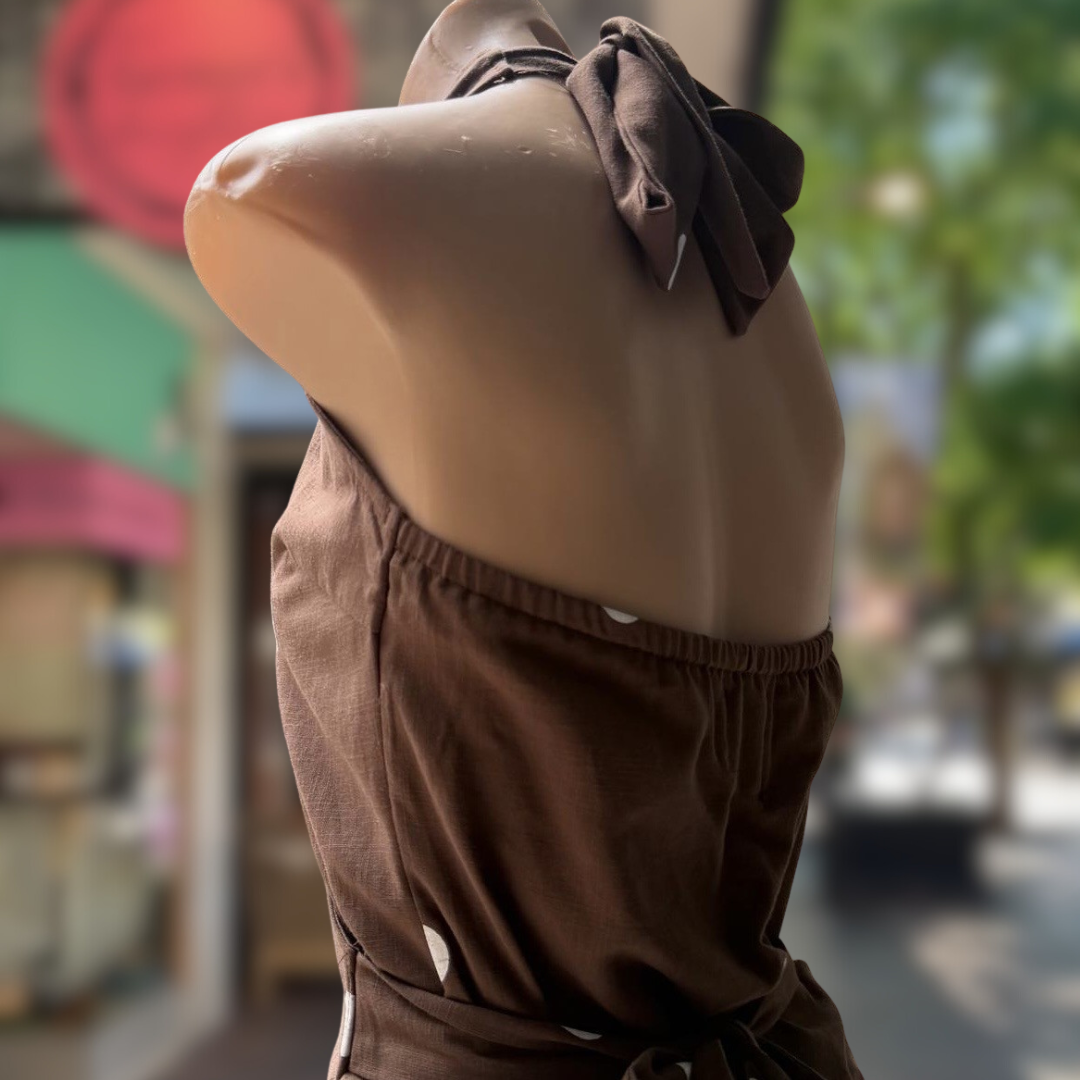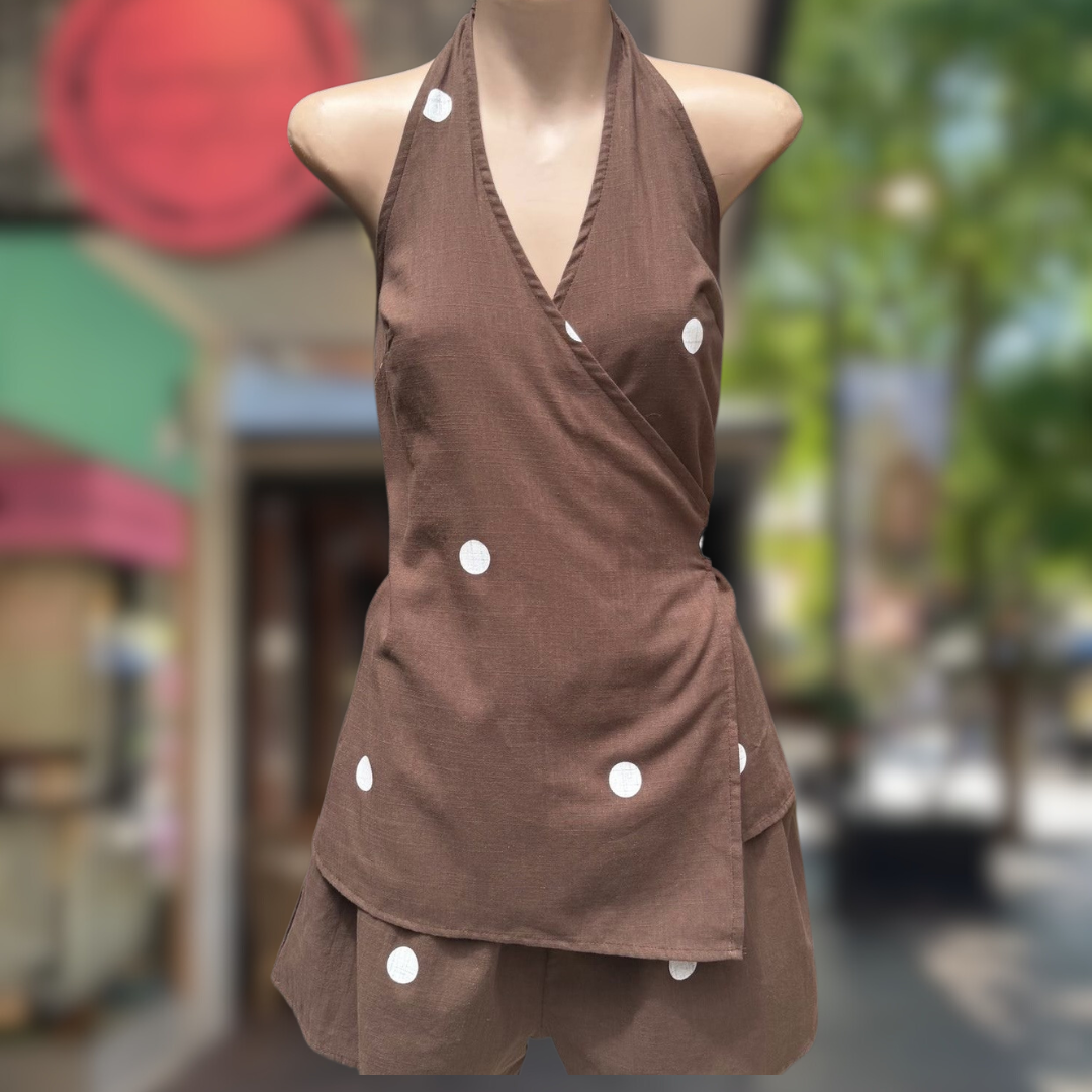 Get ready to party in style with this fab Chocolate & White Polka Dot Halter Wrap Top & Short set from By Frankie!