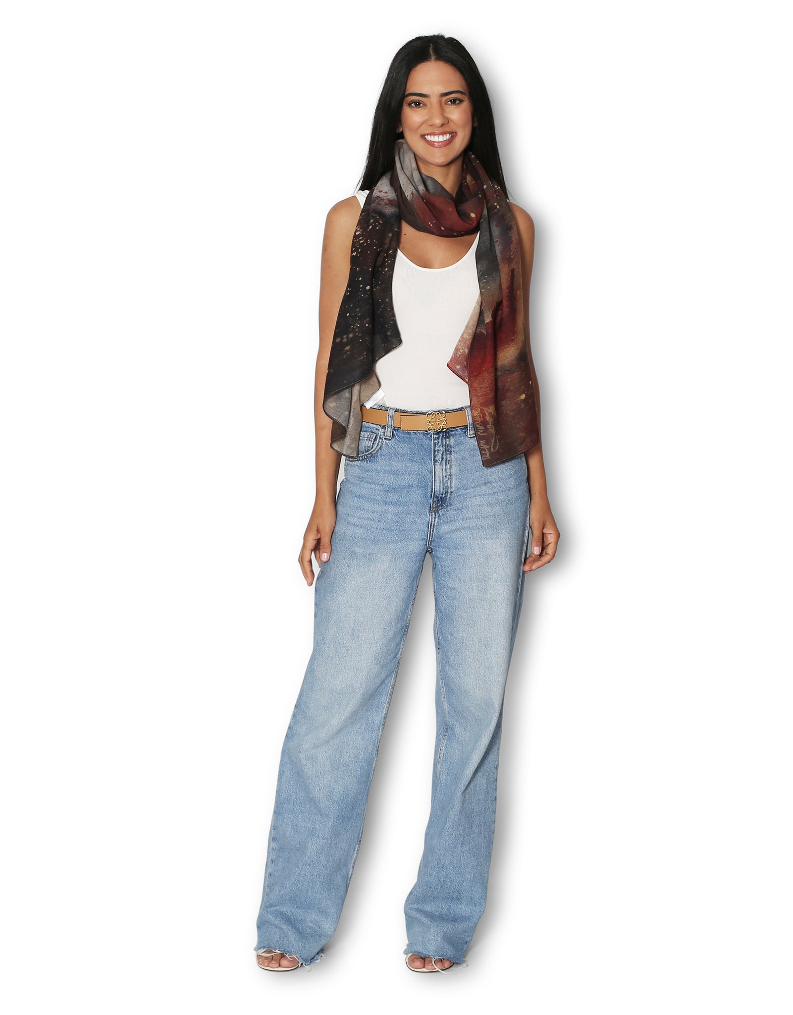 Discover wearable artistry with this stunning wool scarf showcasing Teagan Watts' captivating 'Fantastic Framing' design.