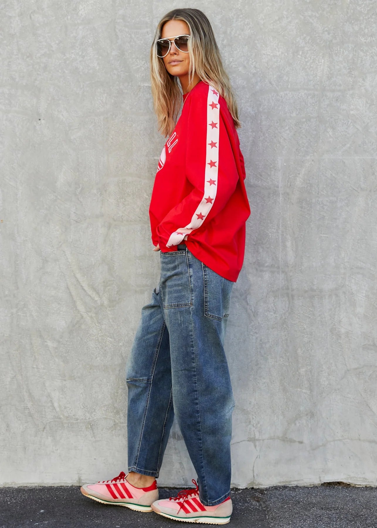Hammill & Co's new retro red long sleeve tee with pink Pickleball print on the front, pink tape with red stars tape down the left sleeve and retro stripes on the left sleeve. A great fitting relaxed, oversized long sleeve tee.