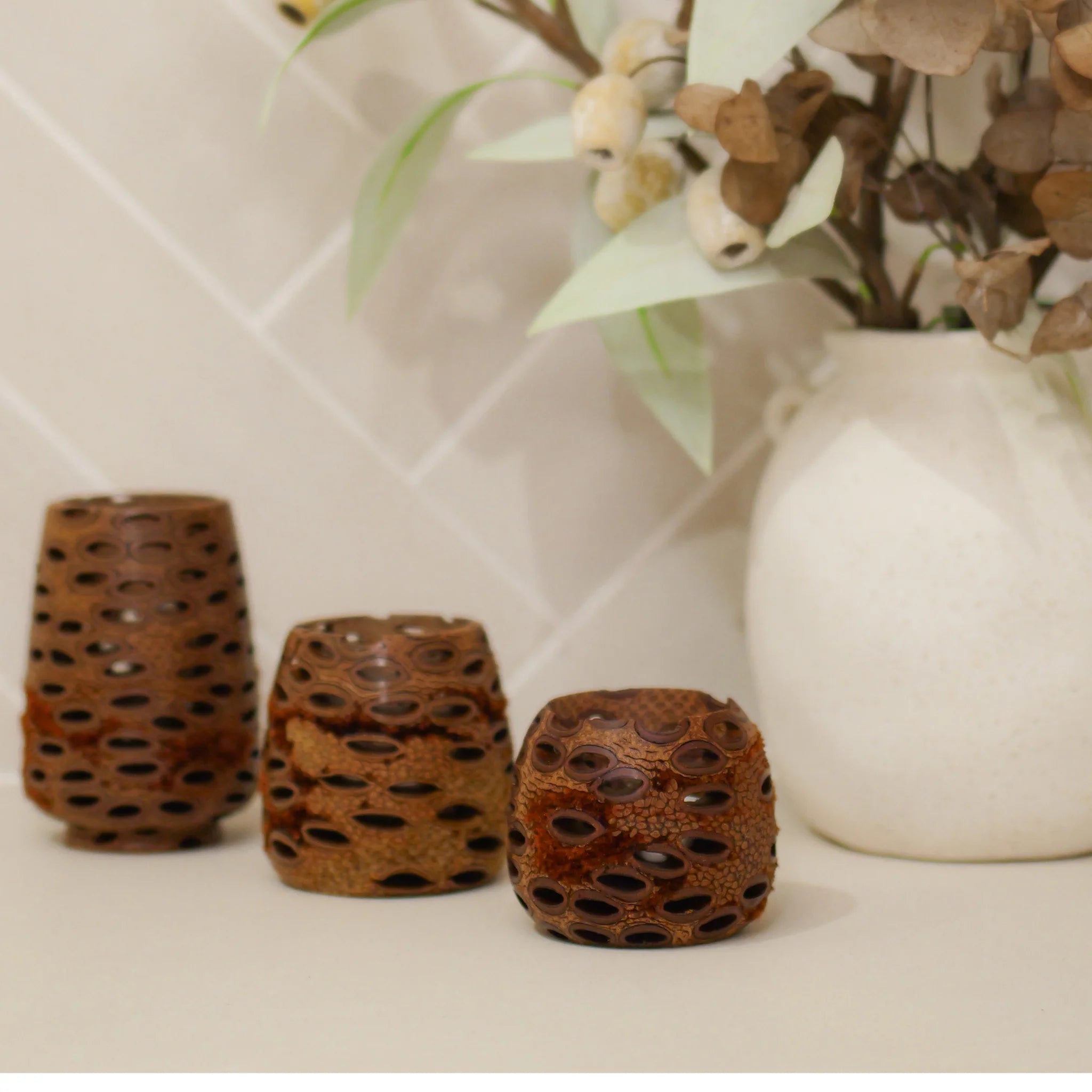 The Banksia Seed Pod is made up of many holes where is once held its seeds. When shaped and hollowed, candlelight can be seen flickering through these naturally formed holes casting a beautiful effect by night.