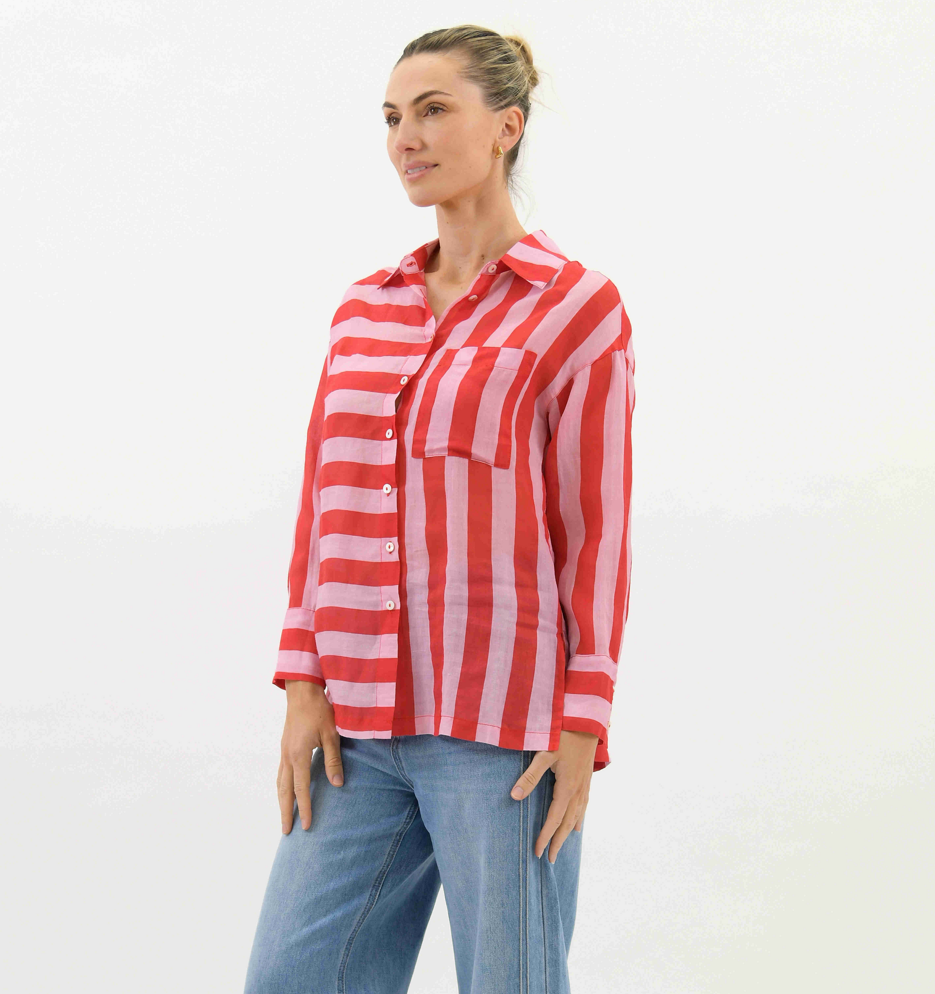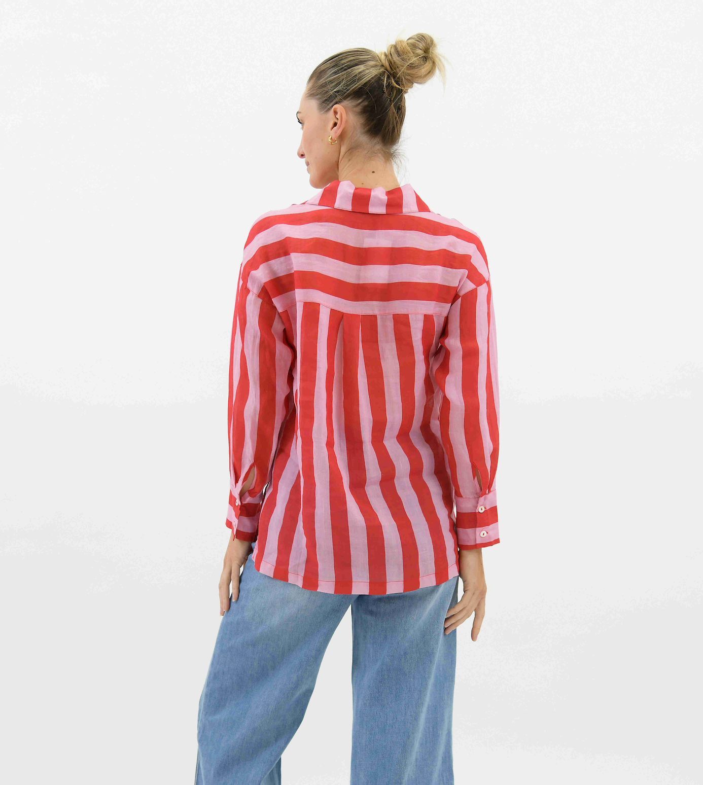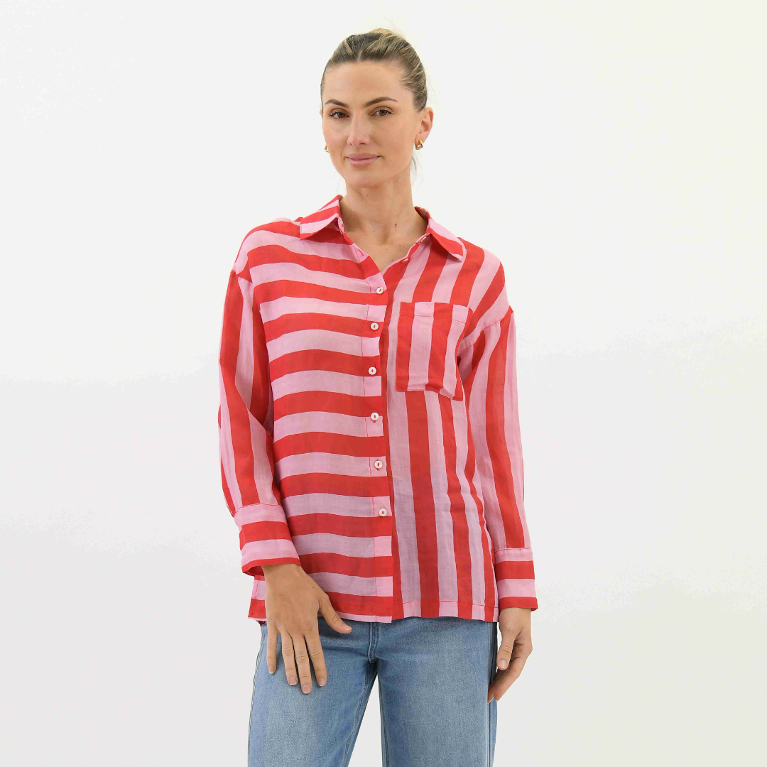 The natural linen fabric keeps you cool while the playful pink and red stripes add a pop of personality to any outfit. Perfect for casual days or dressed up for something special.