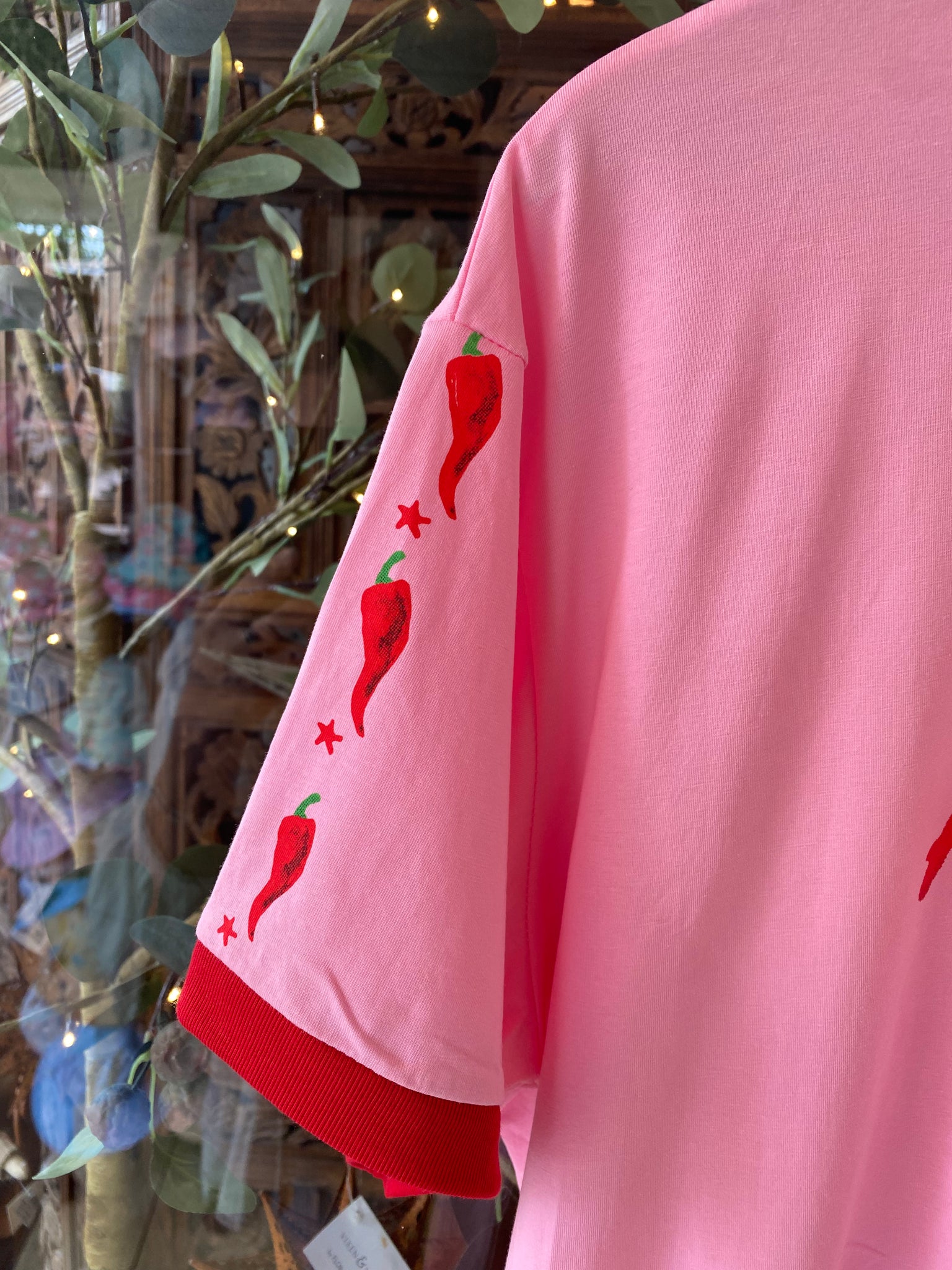 - Hand-painted print with chilli's down the sleeve