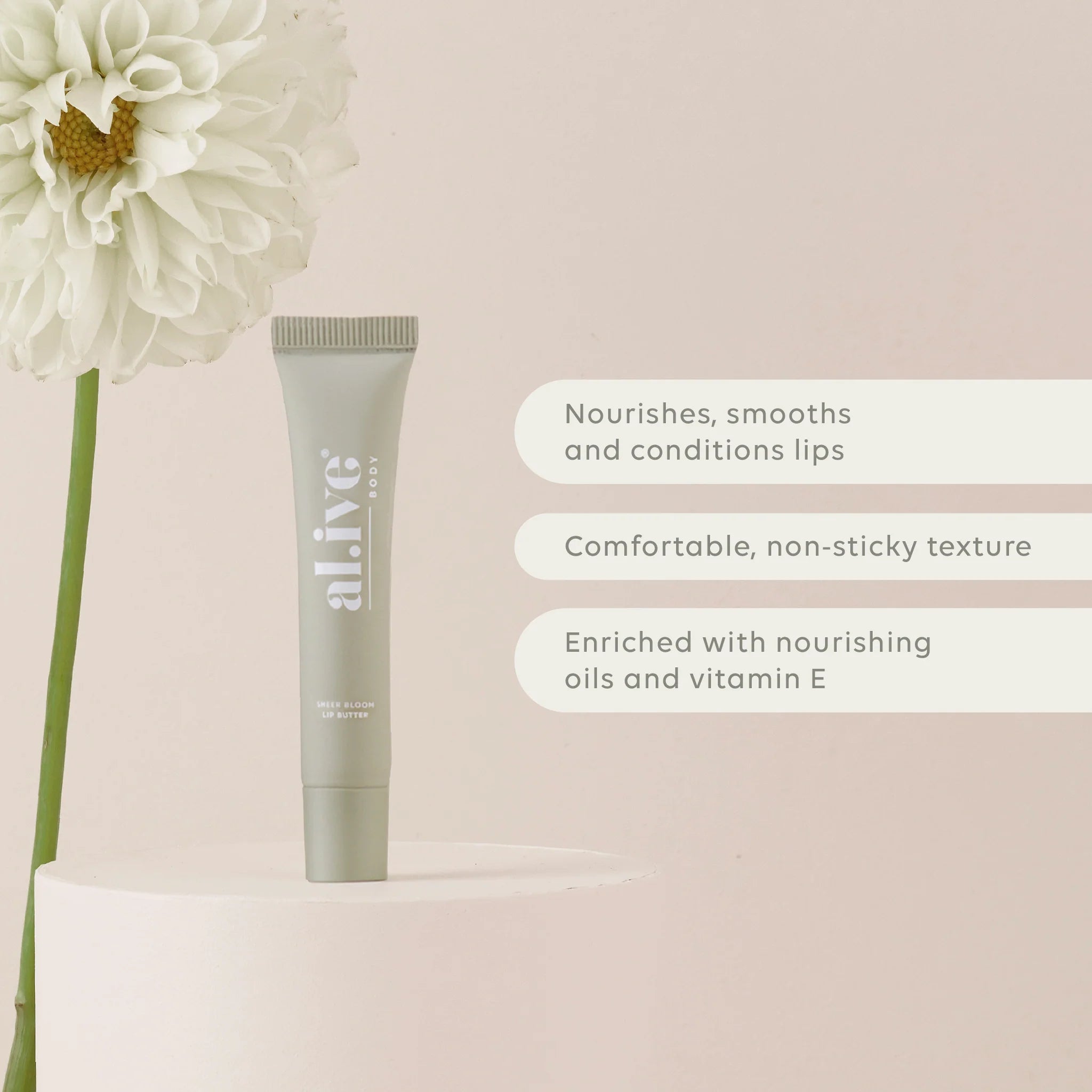 A nourishing 15ml Sheer Bloom Lip Butter enriched with Vitamin E and nourishing oils to support hydration and softness. Lightly scented with a soft, sweet Ivory Bloom aroma inspired by white florals.