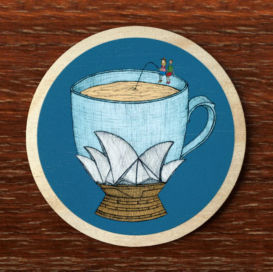 Hand illustrated Sydney coaster with a quirky Australian teacup design. Wooden coaster designed and printed in Australia. Illustration by artist Emily May.