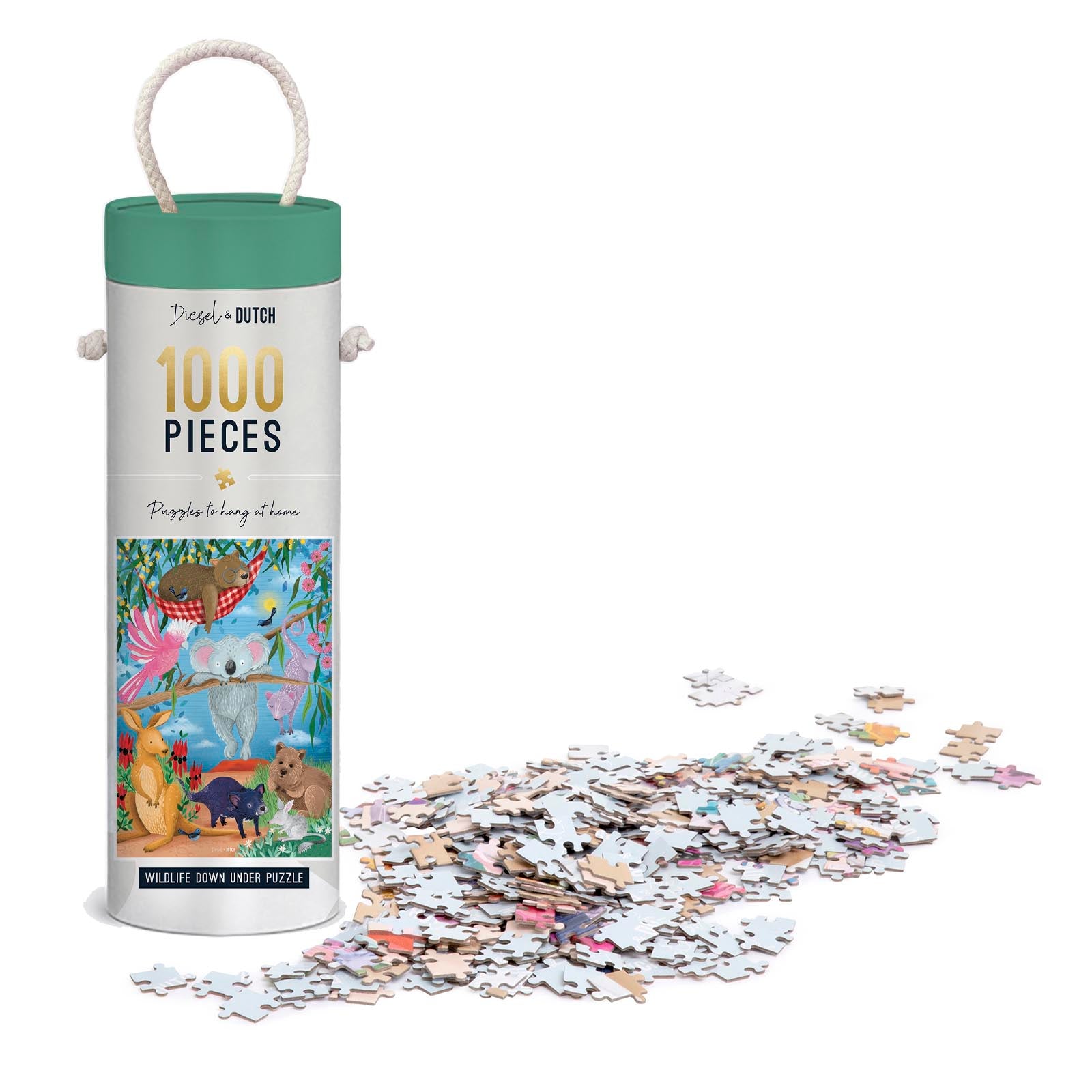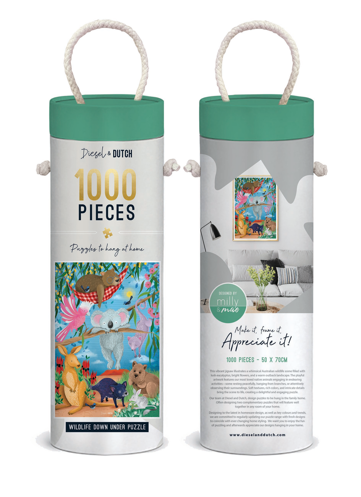 This vibrant jigsaw illustrates a whimsical Australian wildlife scene filled with lush eucalyptus, bright flowers, and a warm outback landscape. The playful artwork features our most loved native animals engaging in endearing activities with some resting peacefully, hanging from branches, or attentively observing their surroundings.