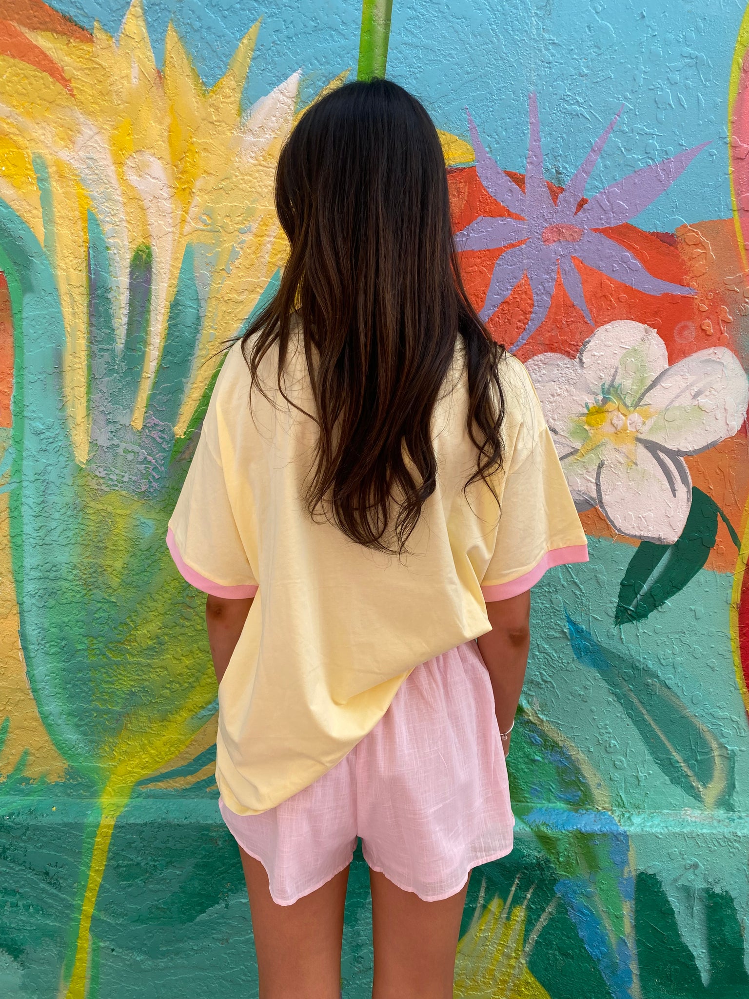 Person wearing a yellow shirt with a graphic design and pink shorts with heart pattern against a colorful mural.
