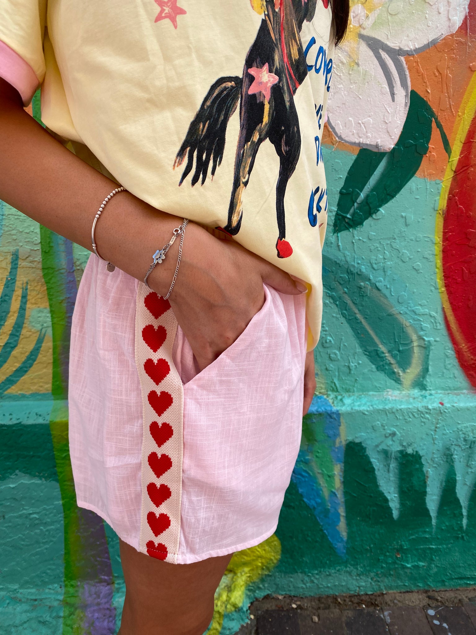 • Relaxed fitting shorts with elastic waist, side pockets and heart racer stripe