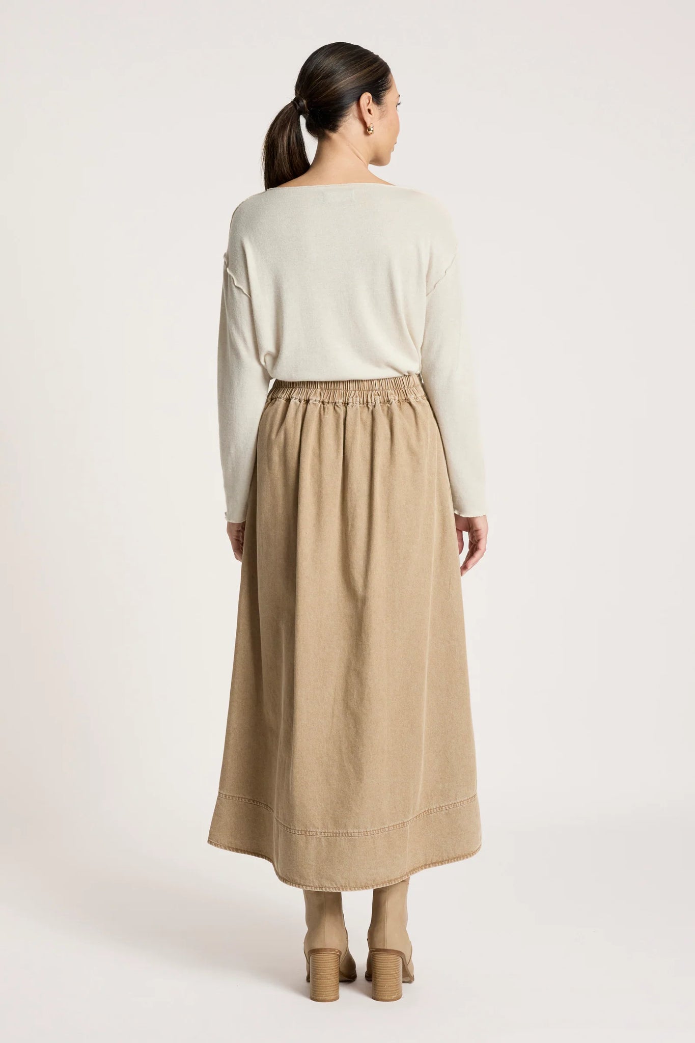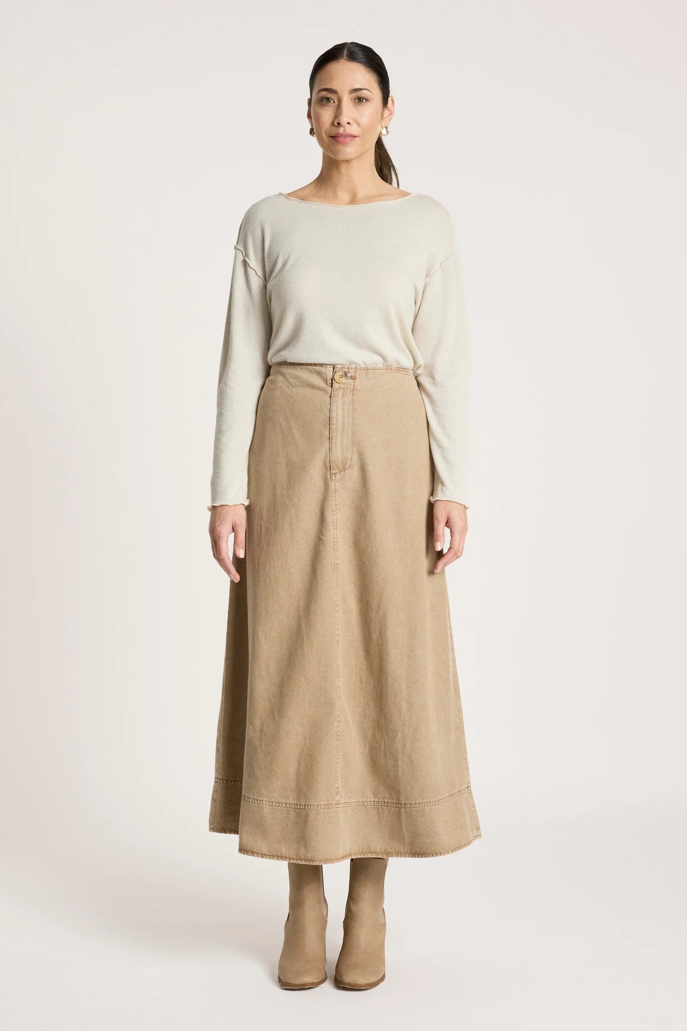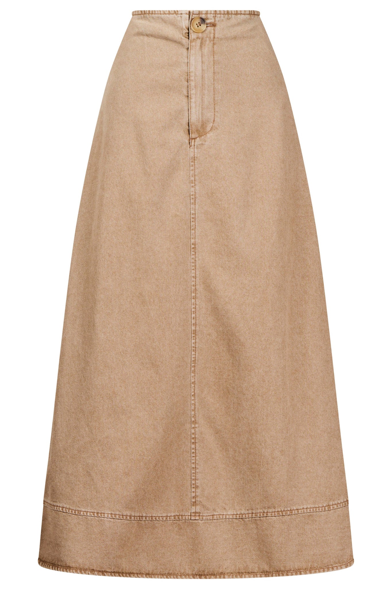 An on-trend A-line denim skirt designed for all-day comfort. Featuring a flat front waistband with button closure and an elasticated back for ease of wear, this style balances structure with flexibility. Finished with topstitch hem detailing and side pockets for practicality.