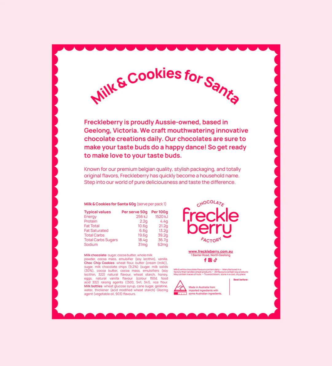 This isn’t your average milk and cookies! 🍪🥛 Freckleberry's festive Christmas Milk & Cookies Block combines smooth Belgian milk chocolate with crunchy choc chip cookies and sweet milk bottle lollies for a playful twist on a classic.