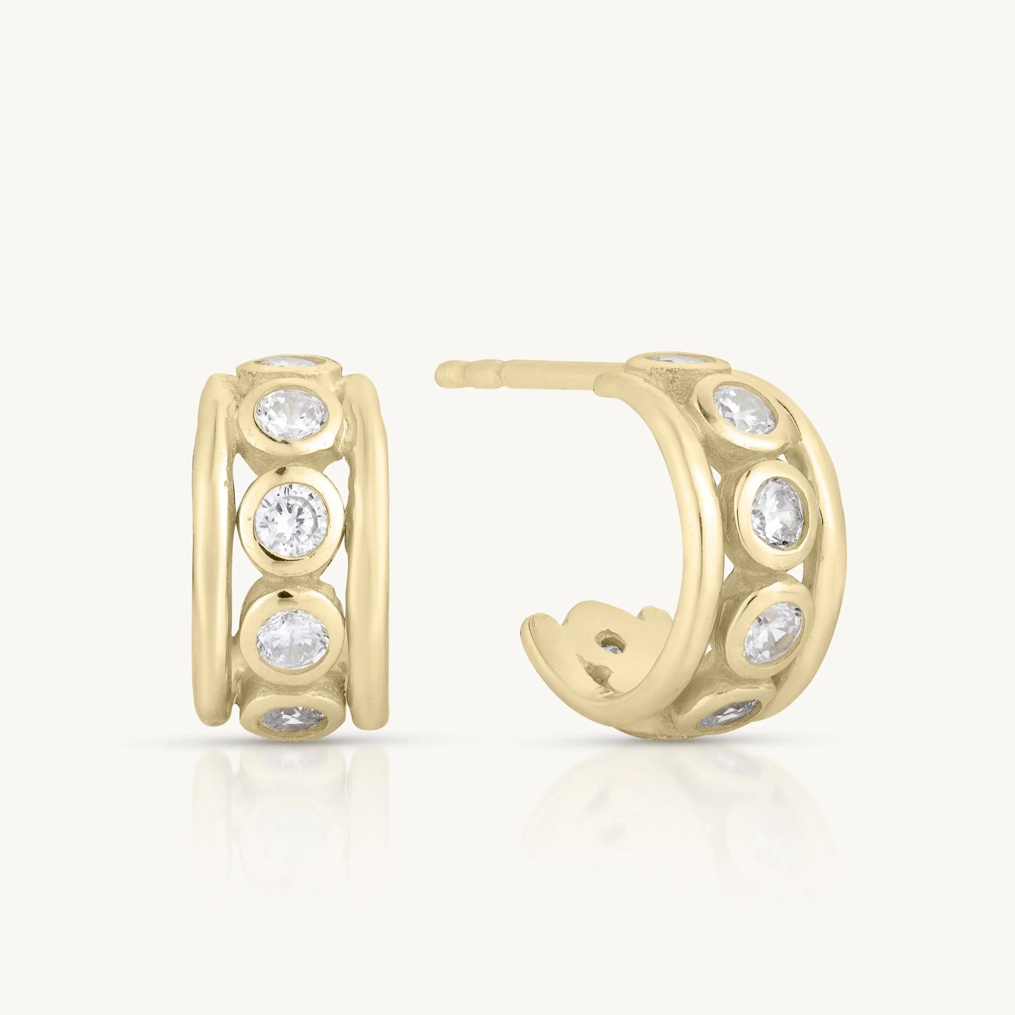 For those who love subtle sparkle, the Olympia Cubic Zirconia Hoops are your new everyday favourite. These round hoops frame an open space, where 14 bezel-set Cubic Zirconia stones dance along the curve.