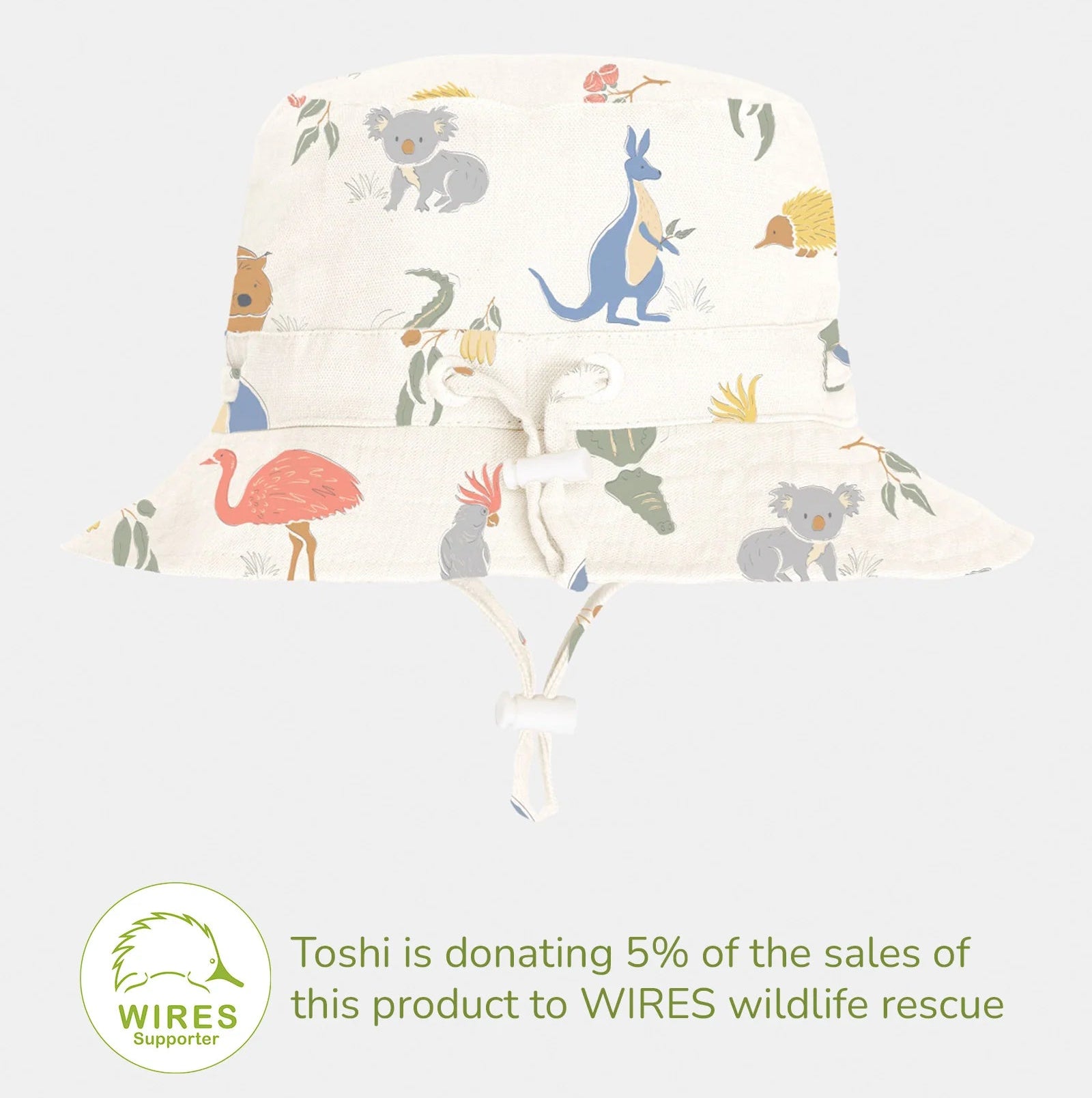 Toshi presents the classic Sunhat Odyssey, ideal for children of all ages. Our sunhat has a broad and well-structured brim offers maximised sun protection. A UPF 50+ UV rating is provided for Snapper & UPF 30+ UV rating for Sunset Island. A head tie creates adjustable sizing and the chin tie with toggle secures the hat for ease of wear. The security release clasp on the chin tie is designed to enhance wearer safety. The classic Toshi Sunhat is crafted from the finest quality 100% cotton and is fully lined for additional comfort. An original and exclusive Toshi print design is featured.